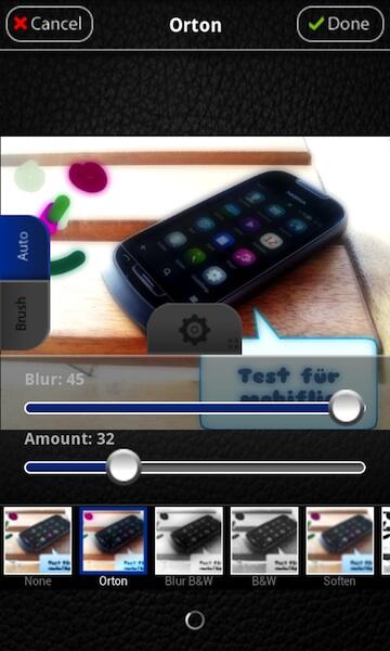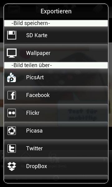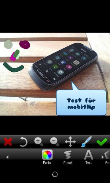 Wie eingangs schon erwähnt können die Bilder auch selbst mit verschiedenen Pinsel-Stärken und -Farben bemalt werden. Die fertigen Meisterwerke können dann entweder auf Facebook, Flickr, Picasa, Dropbox, Fouresquare, Tumblr, Blogger und WordPress hochgeladen oder per MMS und E-Mail versendet werden.