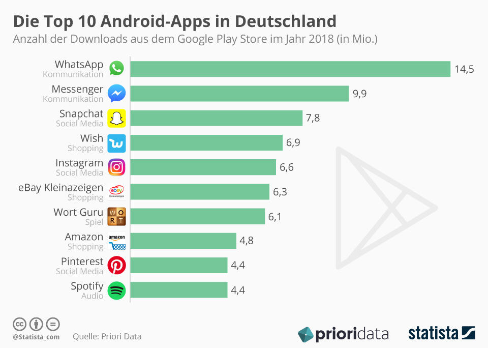 Bei Priori Data hat man sich mit den beliebtesten Apps in Deutschland aus dem letzten Jahr beschäftigt und eine Top 10 für 2018 veröffentlicht. Statista hat die Daten mal wieder in einer passenden Grafik aufbereitet.