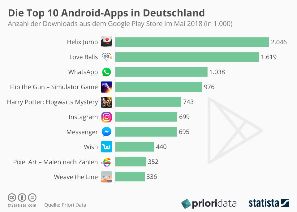 Das Spiel Helix Jump führt it über 2 Millionen Downloads auch im Mai 2018 die Top 10 der populärste Android-Apps in Deutschland an. Nummer zwei ist mit 1,6 Millionen Downloads das Zeichenspiel Love Balls vor WhatsApp, das auf rund eine Million Downloads kommt.
