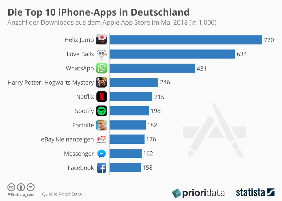 Auch unter iOS ist Helix Jump im Mai die Nummer eins im Ranking der populärsten iPhone-Apps in Deutschland. Auf Platz zwei folgt ebenfalls das Zeichenspiel Love Balls mit 634.000 Downloads. Beschlossen werden die Top drei von WhatsApp, das auf 431.000 Downloads kommt.