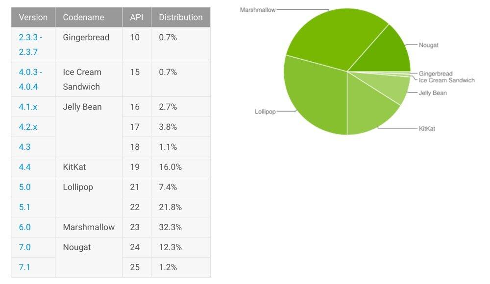 Google wird in ein paar Tagen, vielleicht sogar noch diese Woche, Android O für Nexus- und Pixel-Besitzer verteilen, doch die aktuelle Version von Android N ist noch nicht mal bei 20 Prozent angelangt. Nach einem Jahr. Immerhin wächst Android 7 weiter und kommt mittlerweile auf 13,5 Prozent. Allerdings hat Android 7.0 stärker als Android 7.1 zugelegt. Nur 1,2 Prozent aller Android-Nutzer sind (Stand August 2017) mit der wirklich aktuellen Version von Android unterwegs.