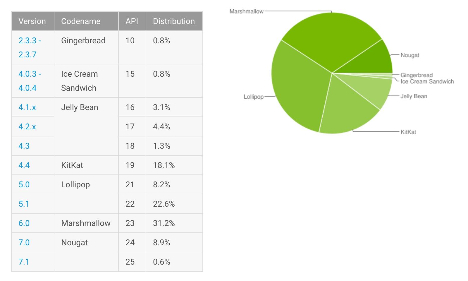 Bei der Verteilung zeigt sich jedoch ein „Problem“, denn es ist nicht Android 7.1, das momentan wächst, es ist Android 7.0 – und das ist nicht die aktuellste Version. Das liegt daran, dass die meisten Hersteller nur Android 7.0 und nicht Android 7.1 für ihre Modelle bereitstellen. Weitere Zahlen gibt es im Entwicklerbereich von Google.