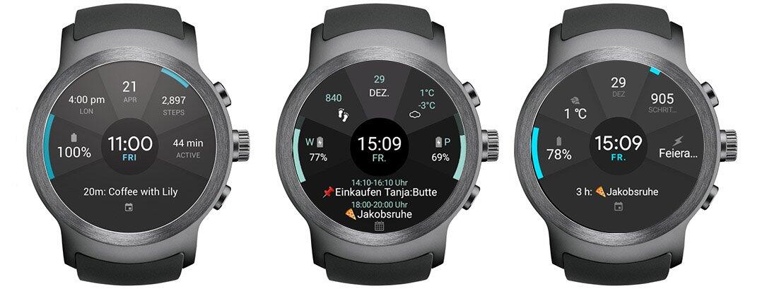 Nach der Installation dieser Anwendung auf der Uhr stehen gleich mehrere, umfangreich anpassbare Watchfaces auf der Smartwatch zur Verfügung. Unter anderem das Watchface Portions, welches fast 1:1 aussieht, wie das Original der LG Watch Sport.