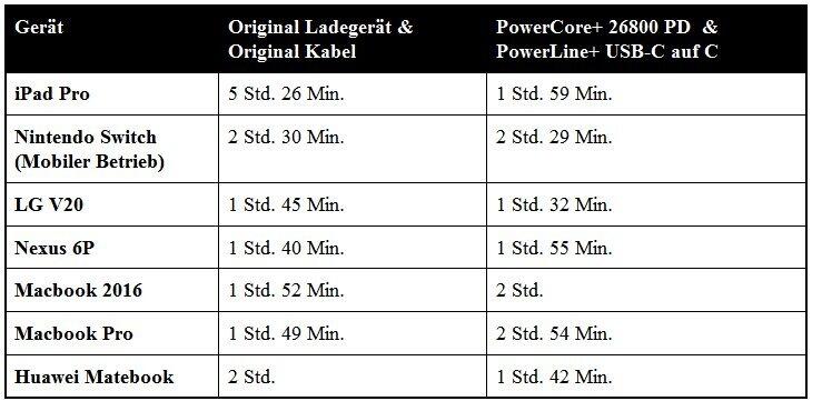 Dies bedeutet im Fall der hier getesteten 26800 mAh (96,48 Wh) Powerbank, dass manche Geräte sogar noch schneller aufgeladen werden, als mit dem original beigelegten Netzteil des jeweiligen Endgeräts.