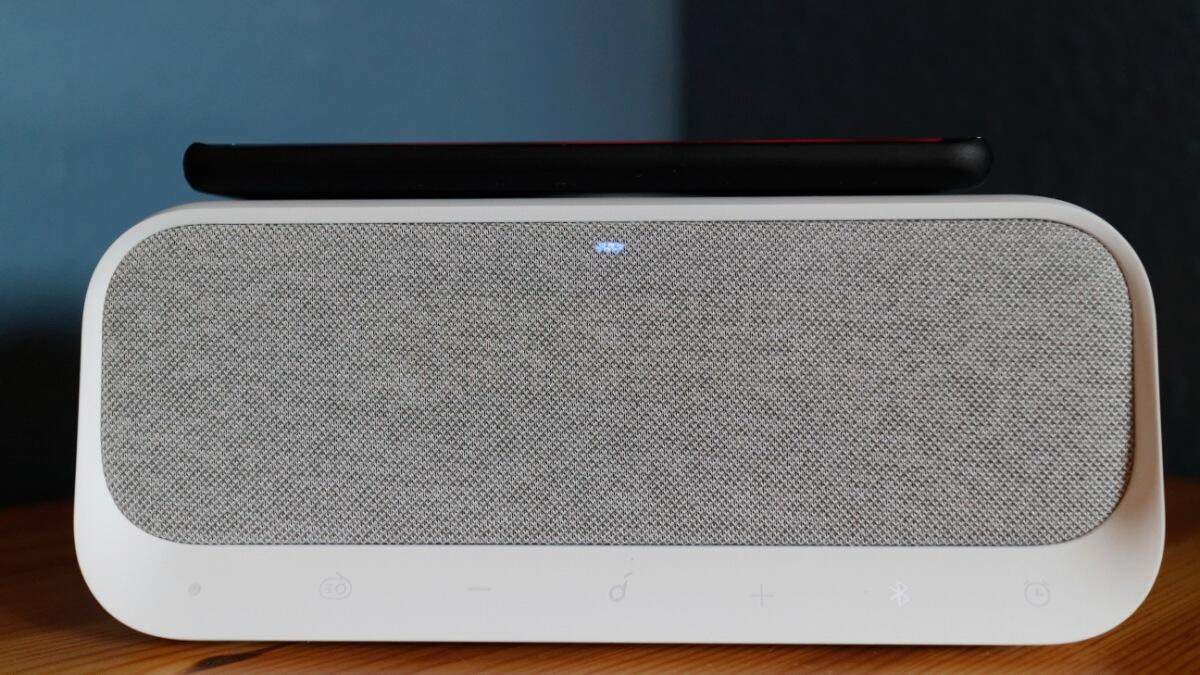 Kommen wir zu guter Letzt zu einem der Highlights des Anker Soundcore Wakey, das dann auch wirklich überzeugen konnte. Der Zubehör-Hersteller kombiniert nämlich nicht nur einen Radiowecker mit einem Bluetooth-Lautsprecher, sondern hat auf der Oberseite auch noch eine Qi-Ladestation verbaut. Sie lädt Smartphones mit bis zu 10 Watt schnell wieder auf und garantiert mit ihrem gummierten Ring, dass sie während des Ladevorgangs nicht plötzlich herunterfallen.