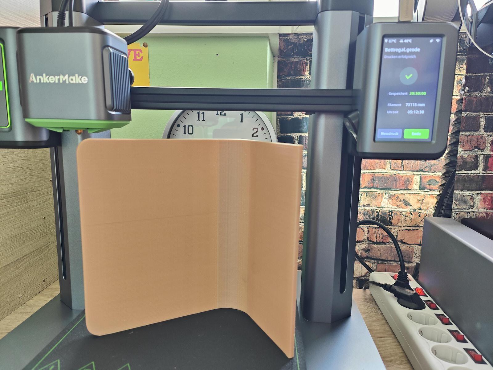Aber zurück zu den Ergebnissen und ein paar meiner Drucke mit dem AnkerMake M5. Die Geschwindigkeit bietet sich natürlich vor allem auch an, wenn man größere Objekte drucken mit weniger Blick auf die Qualität drucken möchte. Gerade dort fällt ein Unterschied von 80mm/s zu 250mm/s absolut ins Gewicht und ist deutlich in der Druckzeit bemerkbar. Ich habe beispielsweise ein kleines Regal für einen Beamer gedruckt, dass ich am Kopfende des Betts einklemme. In dieser Größe würde mich das Regal normalerweise einen Tag Druckzeit kosten. Der M5 hat das souverän in knapp 5 Stunden gedruckt.