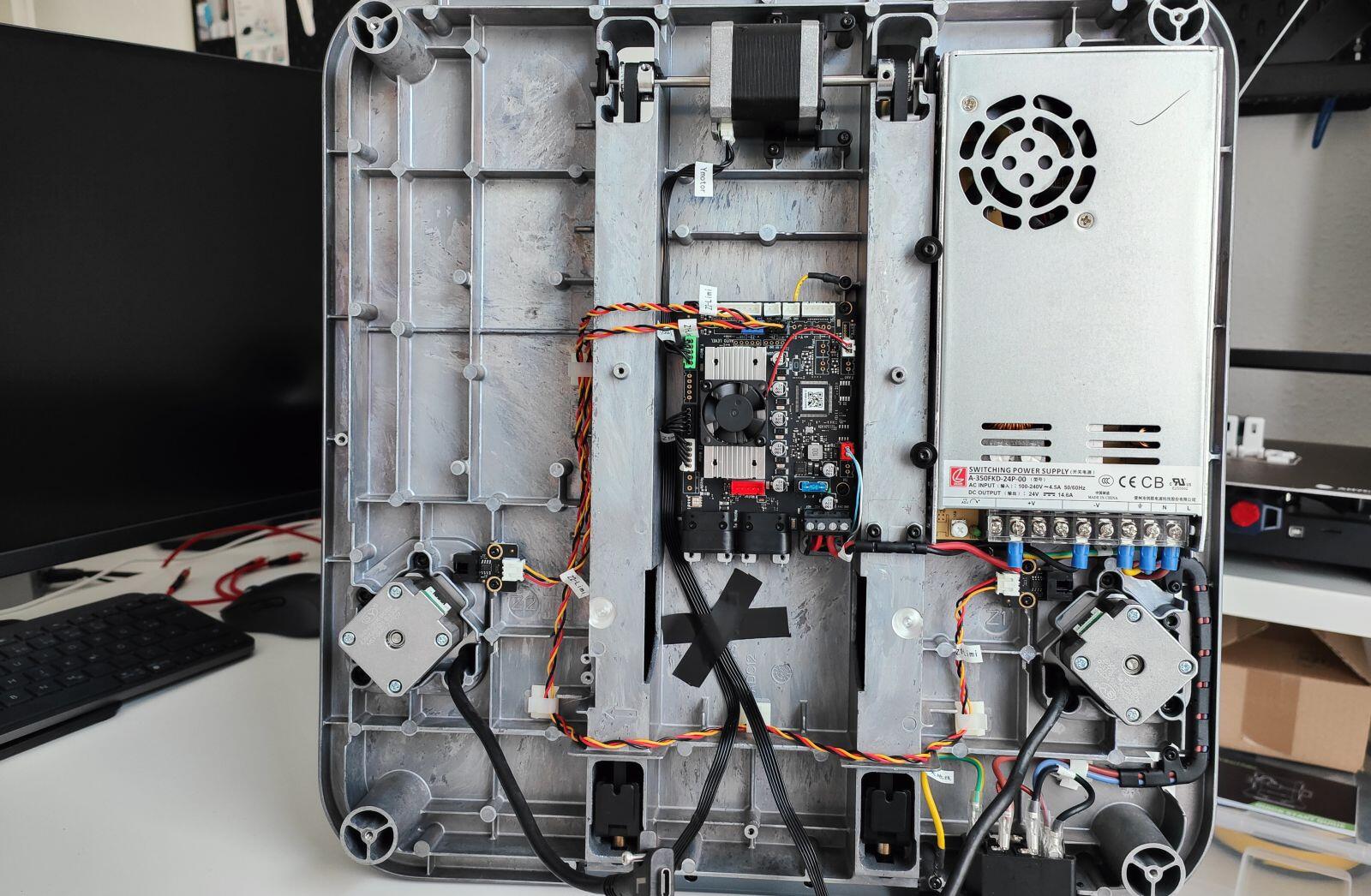 Der Body ist sehr massiv und aus einem Alublock gefräst worden. Hier sehen wir rechts und links den Platz für den oberen Teil der Druckers. Ich hab es mir natürlich nicht nehmen lassen und diesen Body auch mal eben von der Unterseite befreit, um zu sehen, was sich dort alles verbirgt. Das muss euch aber nicht abschrecken, da ihr damit normalerweise ja nicht in Berührung kommen solltet.