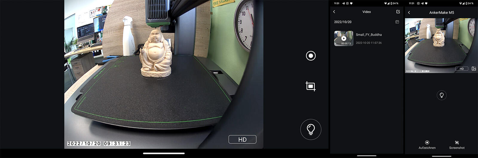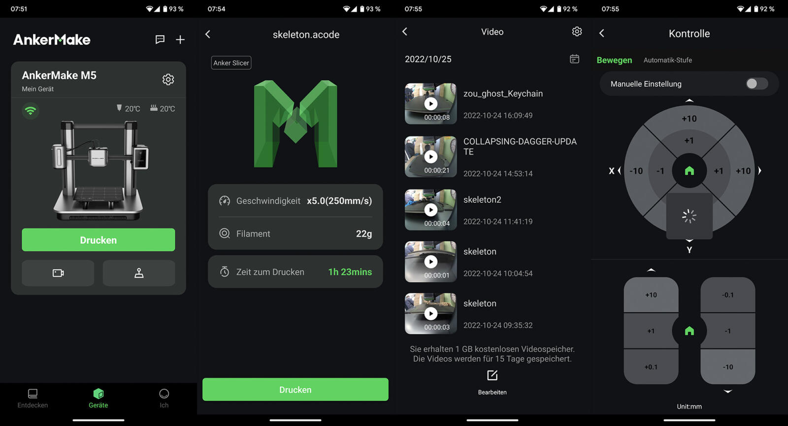 Timelapses können in der App angeschaut und geteilt werden. Über die Kamera kann auch ganz bequem während des Drucks zugeschaut und kontrolliert werden, ob auch alles funktioniert. Dies ist mit dem AnkerMake-Account jederzeit in der App von überall möglich, sobald der Drucker mit einem WLAN verbunden wurde.