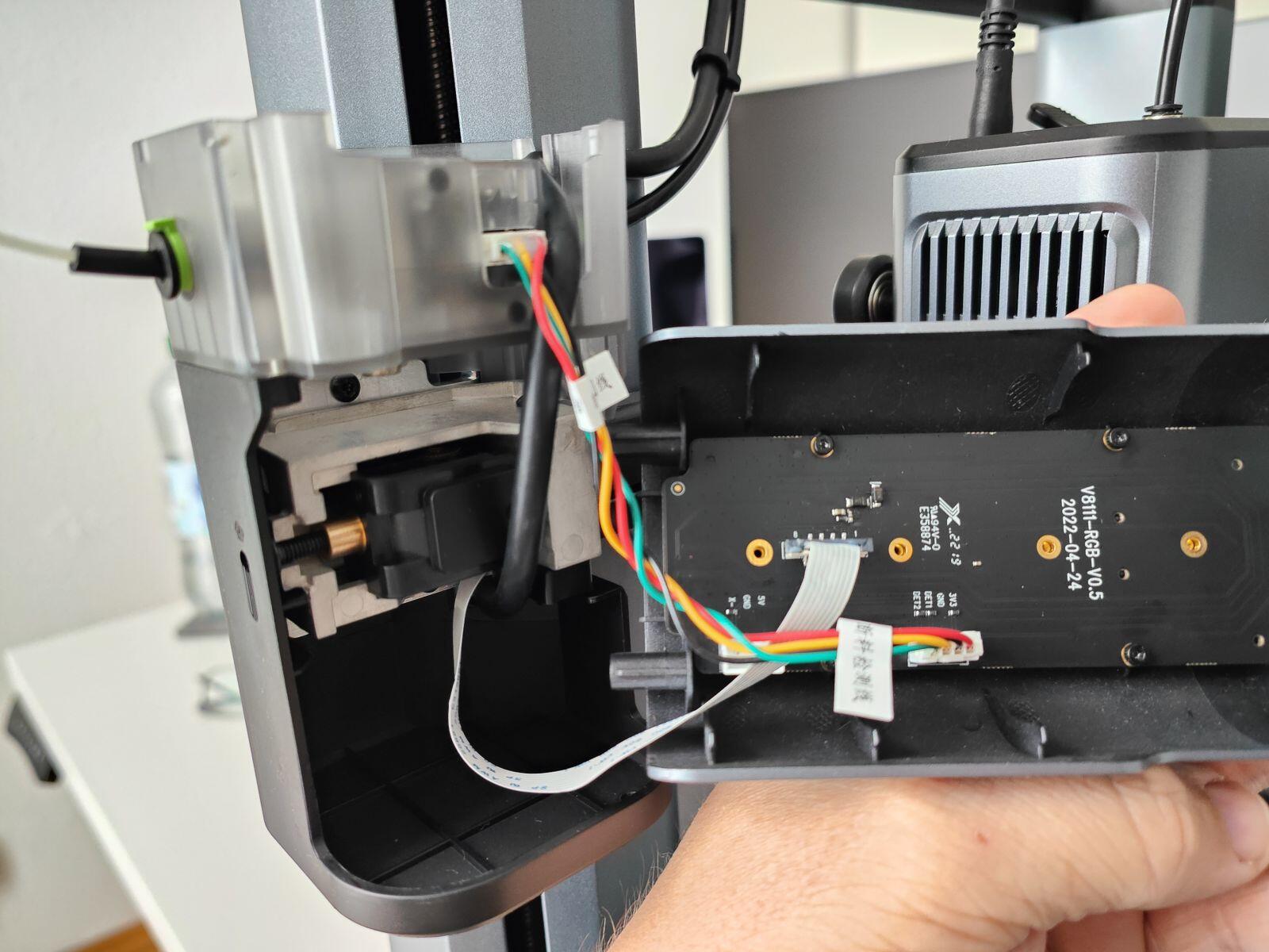 Der obere Teil mit dem Touchscreen, der AI-Kamera, dem Filamentsensor und den beiden Z-Achsen ist schon vormontiert und muss somit nicht mehr extra zusammengebaut werden. So sieht es im linken Gehäuse mit dem Filament-Sensor und der Platine mit der Status-LED aus: