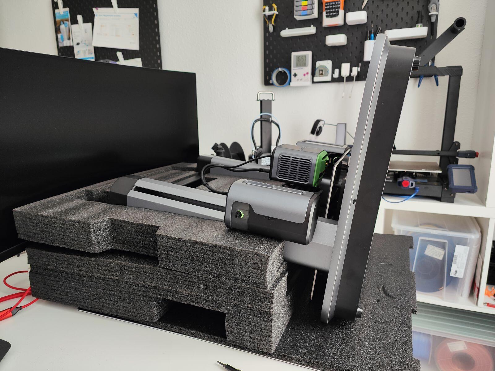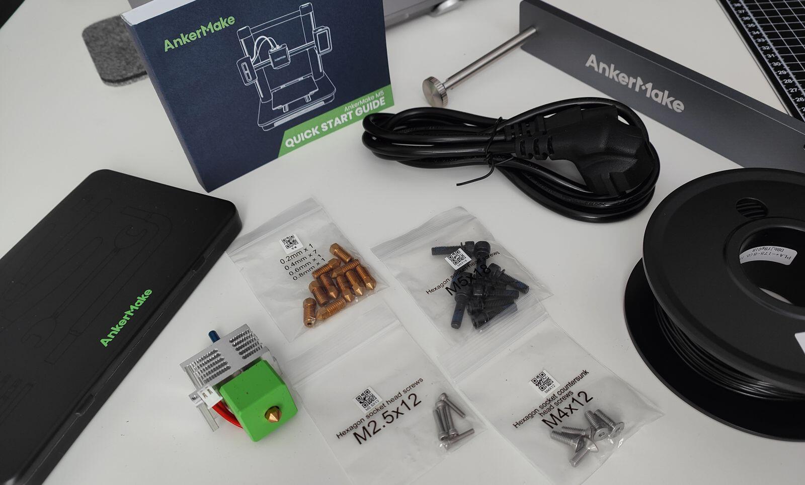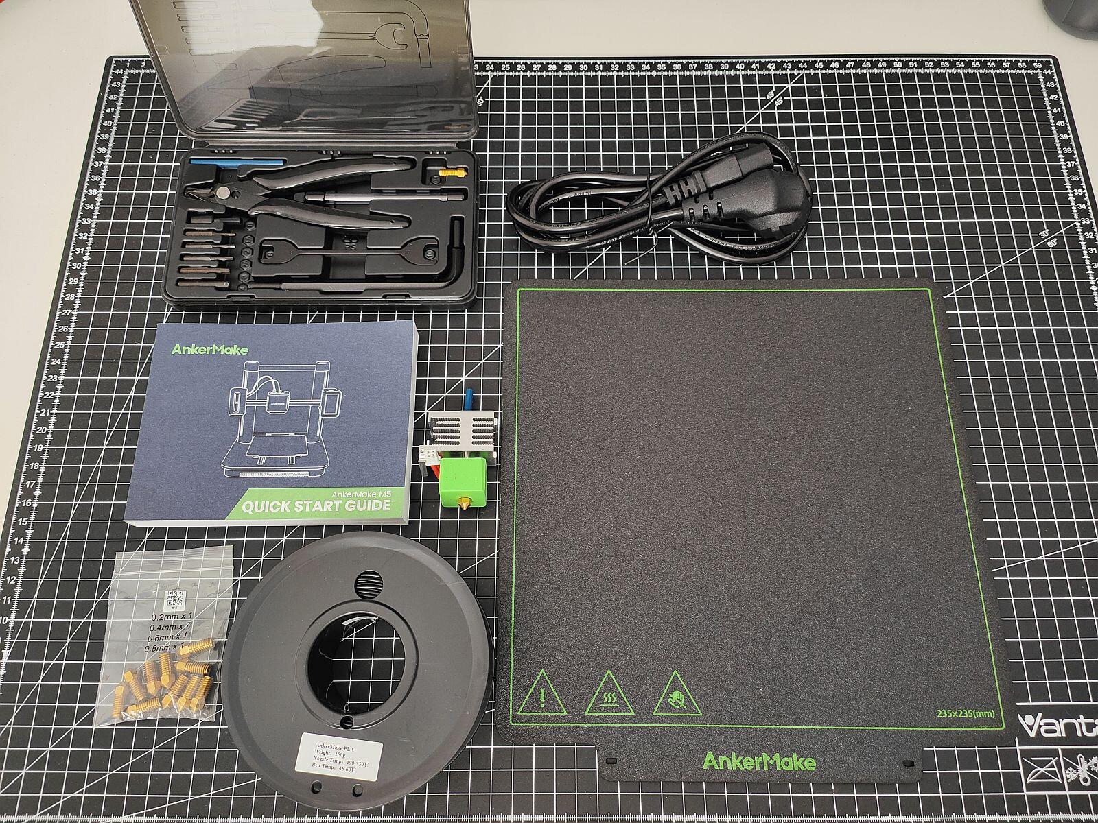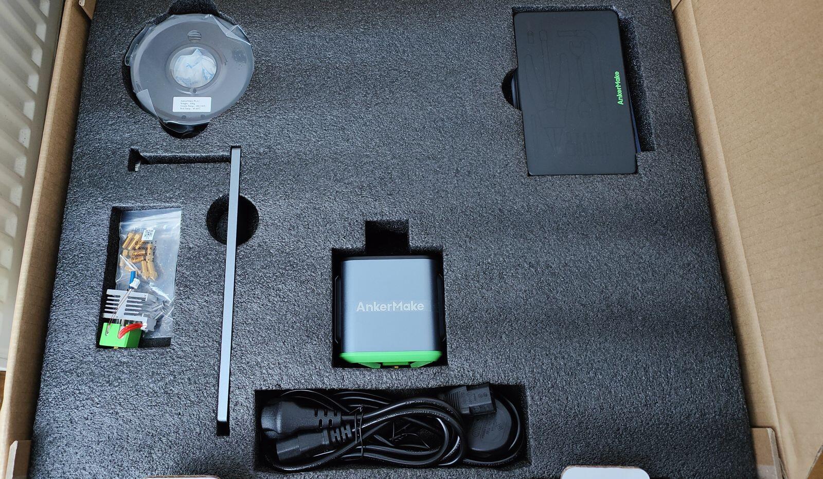 Auch der Ankermake M5 kommt wie von den Mitbewerben gewohnt in einem stabilen Karton ins Haus, in welchem die einzelnen Komponenten in ausgelaserten Aussparungen für den Transport sicher untergebracht sind. Im Lieferumfang finden wir den Drucker selbst in zwei großen Hauptteilen schon vormontiert, dazu noch einen Filament-Halter, einen Ersatzdruckkopf, Stromkabel, eine kleine Rolle Filament zum direkt losdrucken und ein schickes Werkzeugschächtelchen mit den nötigsten Werkzeugen.