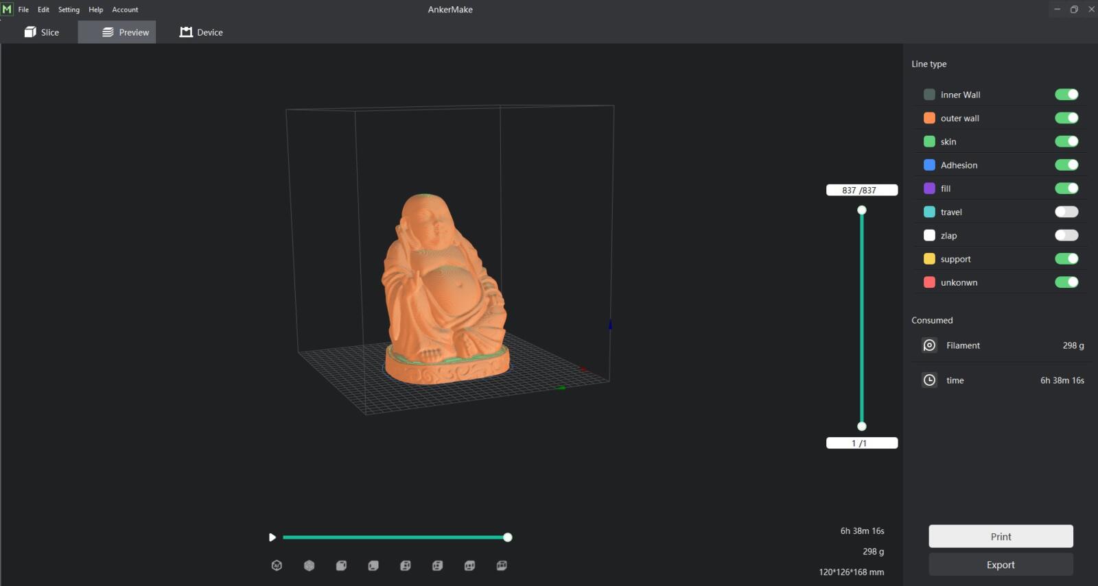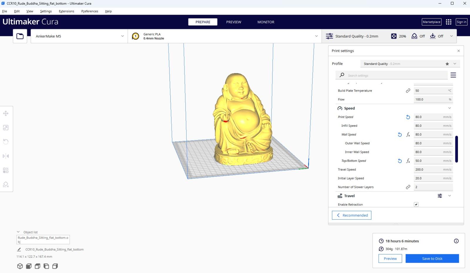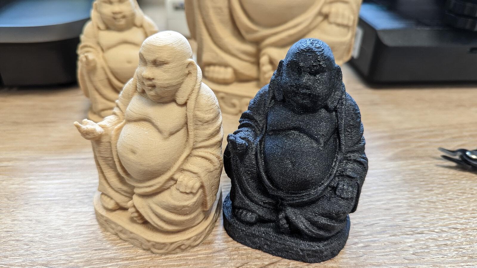 Im Falle des Buddhas bedeutet das mit dem AnkerMake M5 in 250mm/s einen Druck von ungefähr 6 Stunden 40 Minuten und knappen 18 Stunden (!) auf einem meiner sonstigen Drucker mit den 80 mm/s. Wohlgemerkt in der normalen 0.2er Qualität. Also keine weiteren Tricks wie schlechtere Qualität oder dickere Layer oder sowas.