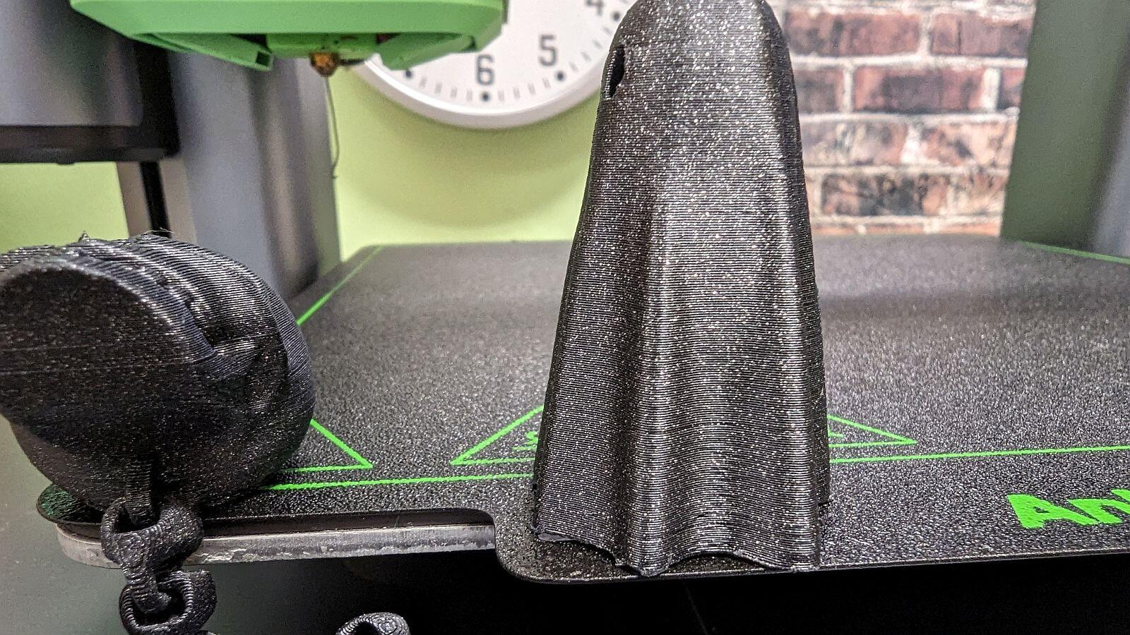 Wie es sich in den Kommentaren herauskristallisiert hat, war der Buddha/Mönch mit seinem schlecht druckbaren Holz-Filament, wobei das Objekt auch noch auf ein viertel im Slicer verkleinert wurde, vielleicht nicht die beste Wahl für ein Demo. Deshalb möchte ich auch noch ein paar Detail-Fotos von zwei schnellen (250 mm/s) Drucken zeigen. Für mich absolut eine akzeptable Qualität, wenn man die dabei gefahrene Geschwindigkeit beachtet. Gedruckt sind beide Modelle mit 0.2er Auflösung auf Noname Glitzer-Filament in PLA. Der Schlüsselanhänger-Geist inkl. rausklappbaren Print-In-Place Füßen benötigte dabei gerade mal etwas mehr als 30 Minuten.