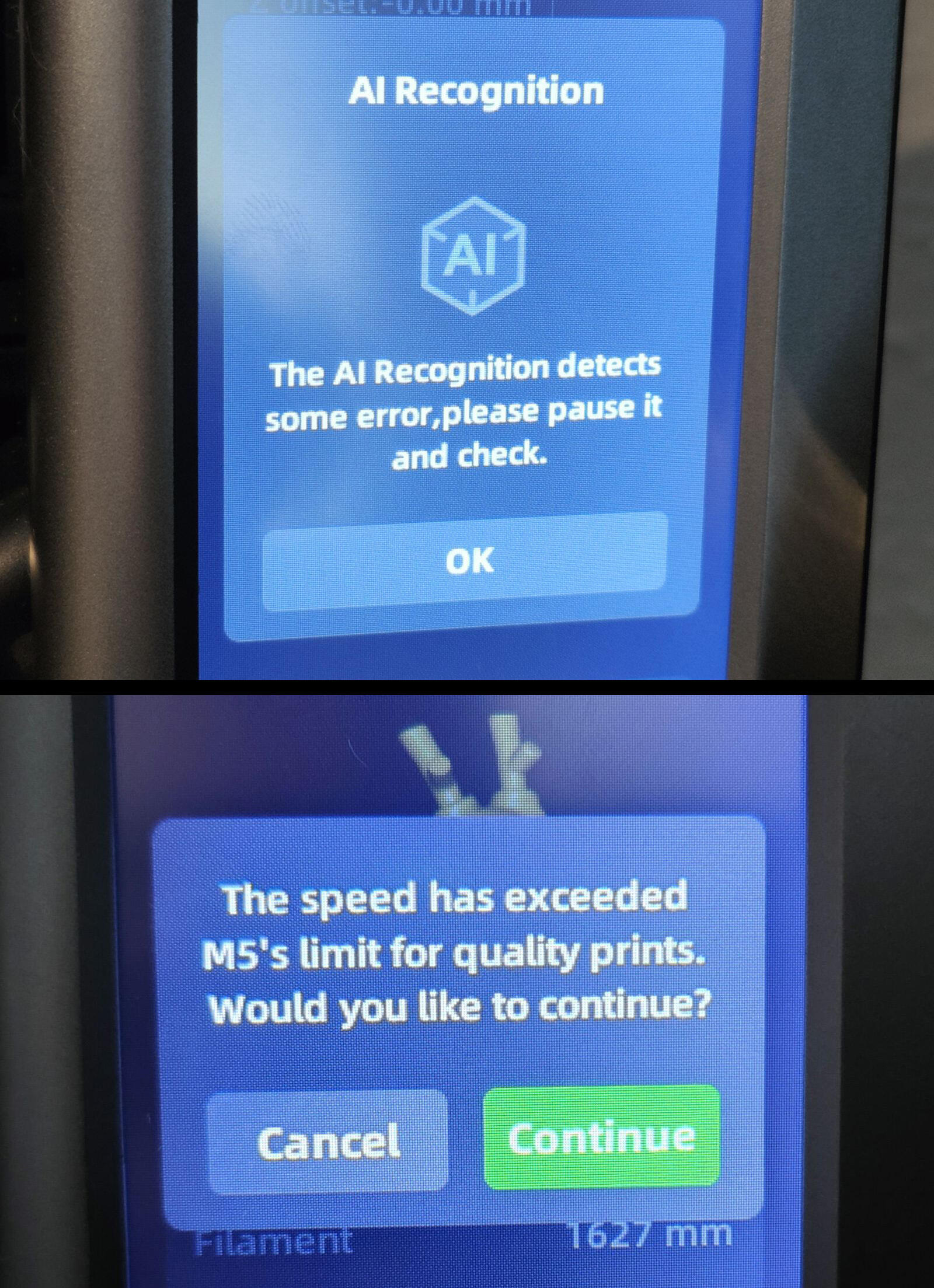 Es gibt aber auch deutlich anspruchsvollere Meldungen, wie z. B. dass die AI einen Fehler erkannte und der Druck doch bitte pausiert werden soll. Ich habe hin- und her überlegt, ob ich den Druck nicht direkt pausieren würde, aber in 2 von 5 Fällen, bei denen ich solche Fehlermeldungen erhielt konnte der Drucker problemlos weiter drucken, weil es am Ende nur der Hauch einer Rille war, der mich später am fertigen Objekt gar nicht gestört hatte, weil ich es eh spachteln und lackieren wollte, oder das Objekt nur ein schneller Prototyp eines gedruckten Werkzeugs war. Hätte der Drucker hier bei einem langen Druck womöglich über Nacht pausiert, wäre der Druck am Ende gar nicht morgens fertig gewesen und ich hätte dann manuell wieder starten müssen.