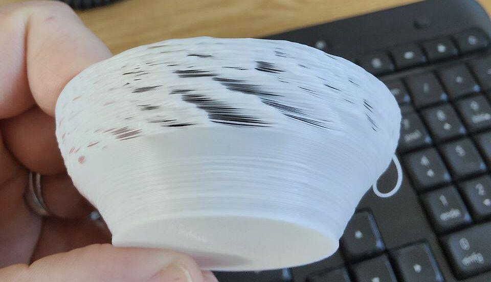 So sah mit dem Sunlu T3 beispielsweise der untere Teil eines Schneemannes im Vasenmodus mit aktivierter Speed-Option (250 mm/s) aus. Der Drucker an sich ist schon super. Vor allem zum Early Bird 150 EUR Kickstarter-Preis, aber die Speed-Option ist seeehr vom gedruckten Objekt abhängig.