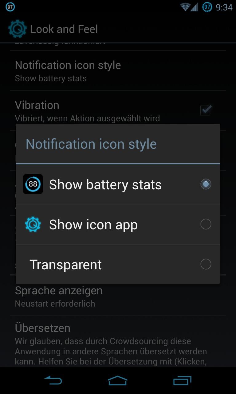 Die Einstellungen lassen verschiedenste Konfigurationen zu. Es gibt diverse Themes schon per Default in der App und auch die Breite und Höhe der Icons können eingestellt werden. Ein Icon in der Beanchrichtigungsleiste verhindert, dass die App von Android aus dem Speicher geworfen wird. Hier wurde aber mit gedacht und man kann sich als Icon beispielsweise den aktuellen Akkustand als Symbol einblenden lassen.