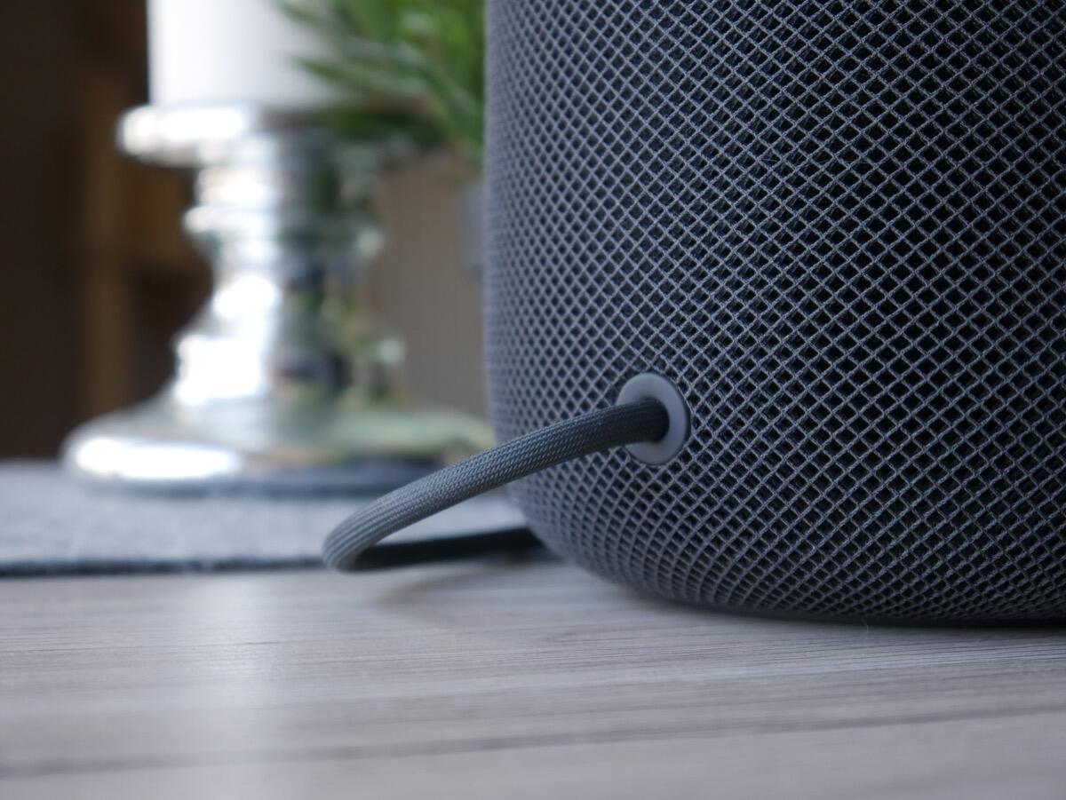 - Das Stromkabel besitzt einen proprietären Anschluss und kann von offizieller Seite nicht gewechselt werden. Es ist allerdings möglich es mit einem festen Zug aus dem HomePod zu entfernen, jedoch wird es nicht einzeln angeboten.