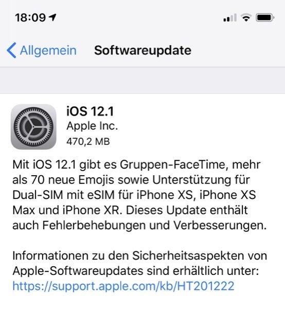 Mit iOS 12.1 gibt es Gruppen-FaceTime, mehr als 70 neue Emojis sowie Unterstützung für Dual-SIM mit eSIM für iPhone XS, iPhone XS Max und iPhone XR. Dieses Update enthält auch Fehlerbehebungen und Verbesserungen.