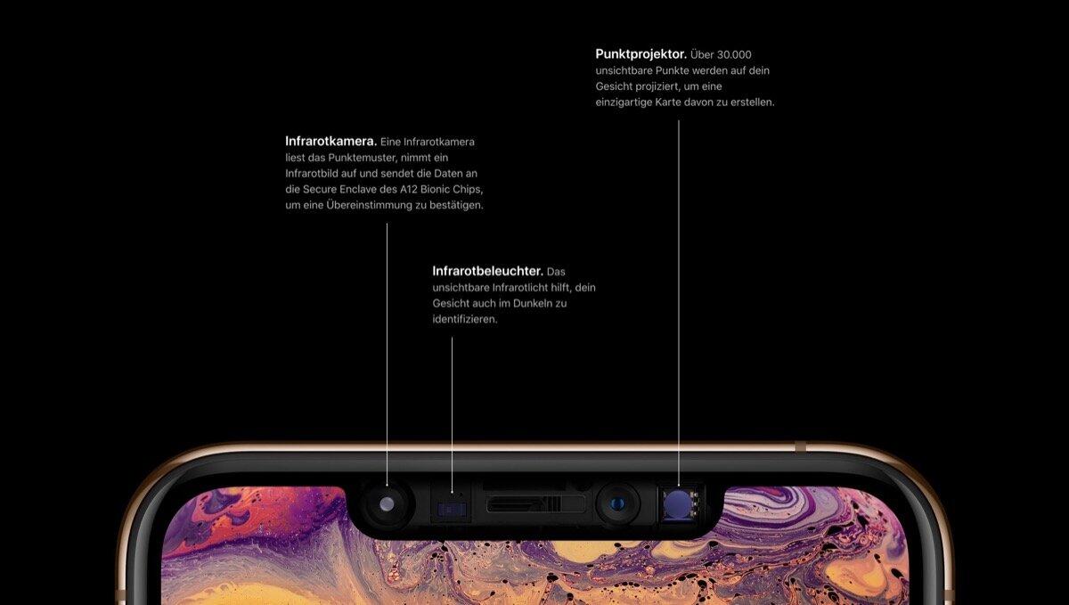 Wenn ich das richtig verstehe, dann wird man den Punktprojektor und den Infrarotbeleuchter hinter dem OLED-Display verstecken können. Würde aber auch bedeuten, dass Frontkamera, Infrarotkamera und Lautsprecher weiterhin vorhanden wären. So sieht die Notch aktuell bei Apple aus: