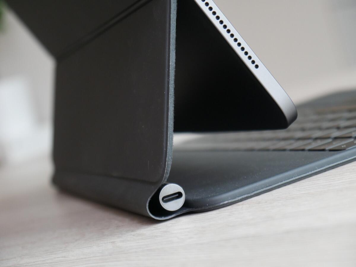 - Das Apple Magic Keyboard selbst besitzt einen USB-C-Anschluss, der aber nur zum Laden dient. Das ist aber dennoch sehr praktisch, denn a) bekommt man damit einen zweiten USB-Port, wenn man den anderen für Dinge wie eine Speicherkarte nutzt und b) lässt sich das iPad so viel angenehmer auf dem Tisch beim Arbeiten laden.