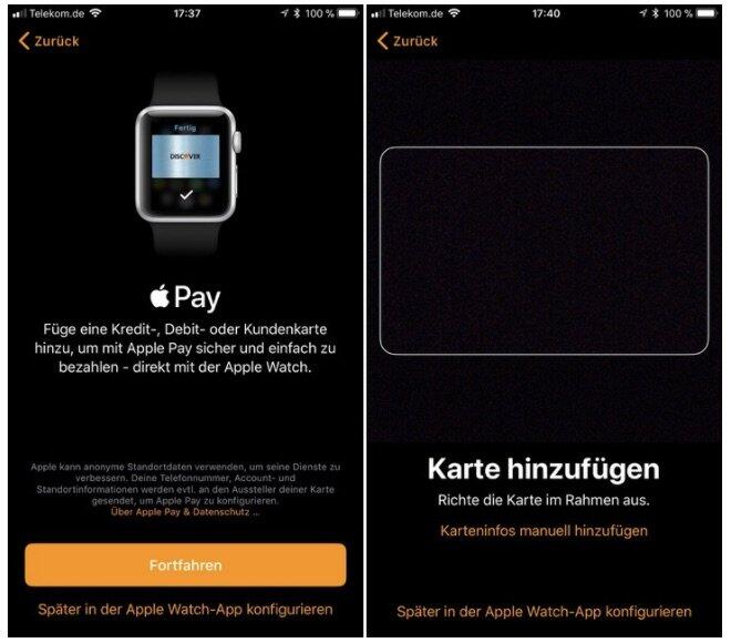 Ein Leser von MacRumors hat der Seite zwei Screenshots geschickt, die auf einen Start von Apple Pay in Deutschland hindeuten. Bei der Einrichtung der aktuellen Beta-Version von iOS 11 und watchOS 4 wurde dieser aufgefordert Apple Pay zum Bezahlen einzurichten. Das Hinzufügen einer Karte war aber nicht möglich.