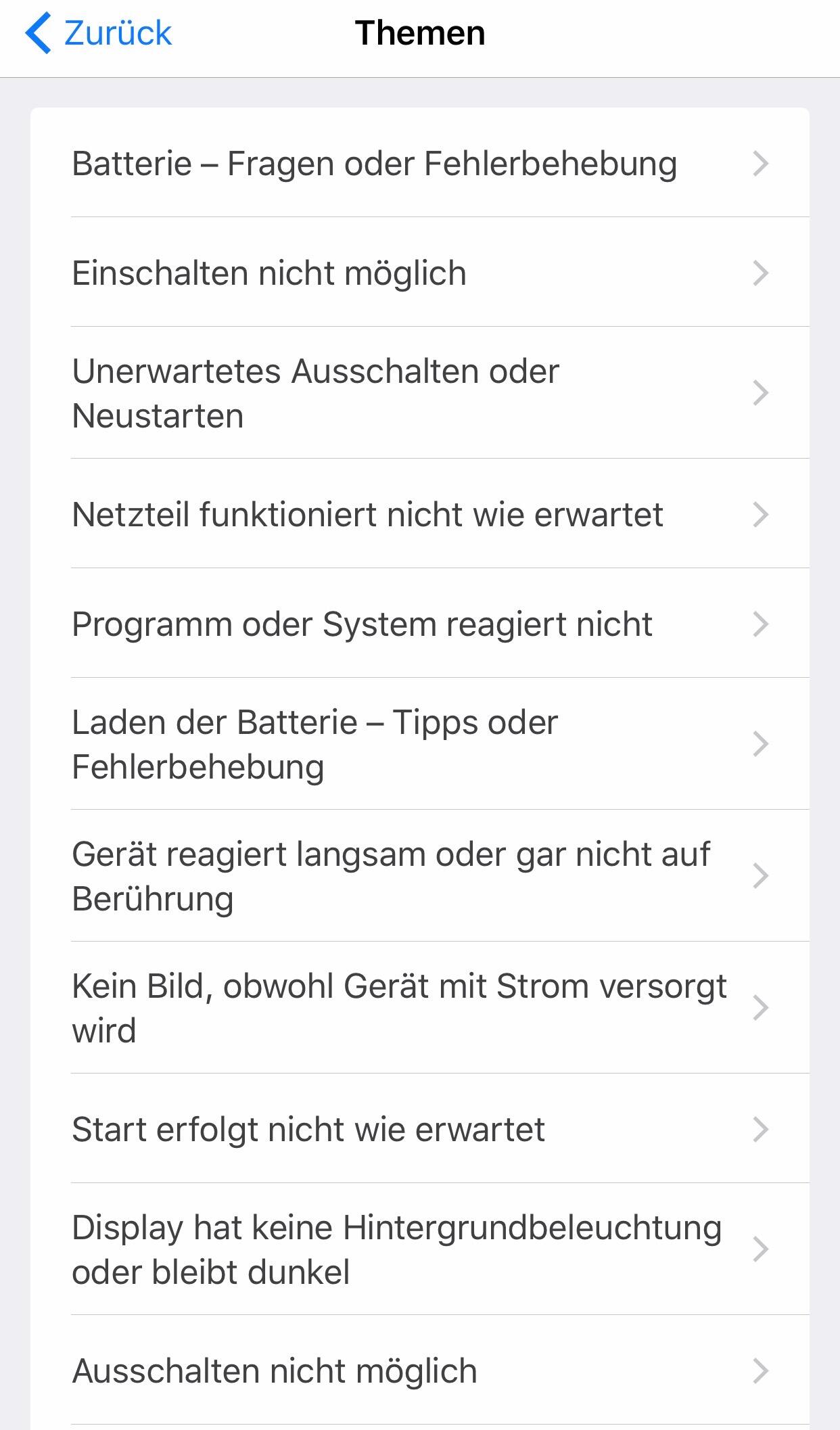 Wählt ihr aus der Übersicht eines eurer Geräte aus, bekommt ihr eine Auswahl an Optionen, mit denen ihr potentielle Probleme haben könntet. Wählt ihr hier zum Beispiel den ersten Punkt „Batterie, Stromversorgung und Aufladen“, könntet ihr beispielsweise einen Termin machen, um euren alten Akku austauschen zu lassen. Oder aber ihr nutzt erstmal ein persönliches Gespräch oder einen Chat. Wie lange es ungefähr dauern wird, bis ihr am Zug seid, wird euch direkt eingeblendet.