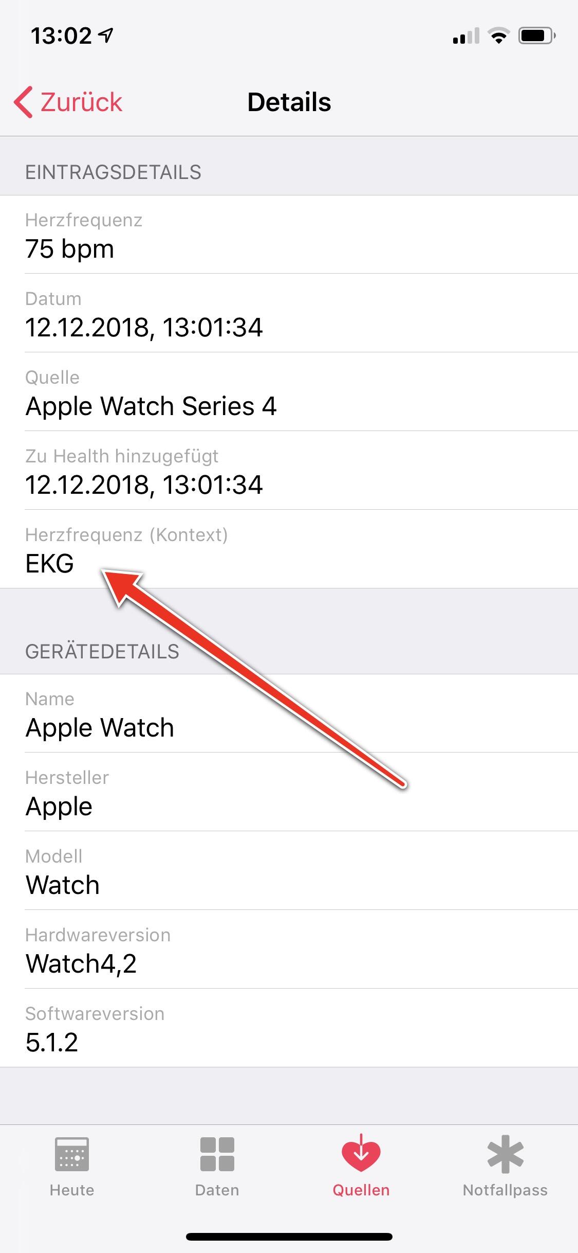 Zudem wird in den Details zur Messung in der Health-App vermerkt, dass es sich um eine EKG-Herzfrequenz-Messung handelt.