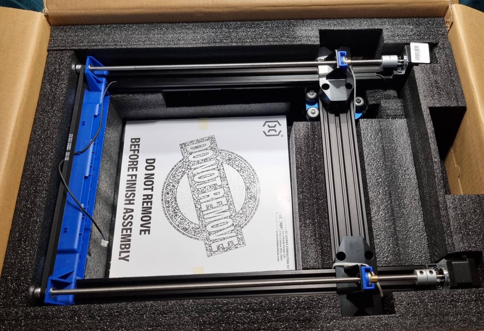 Im nächsten Schritt werden die Transportsicherungen entfernt. Dies bedeutet in diesem Fall also etwaige Schaumstoffe und Kabelbinder, welche die Achsen fixieren usw. Das sollte es dann grob schon gewesen sein und wir können loslegen!