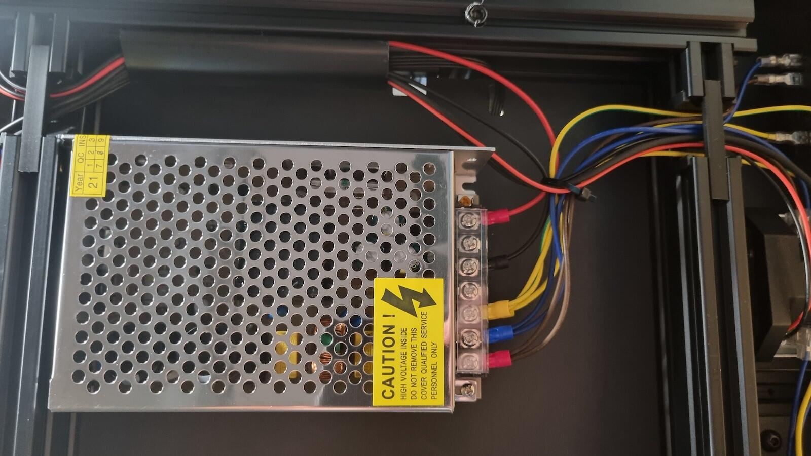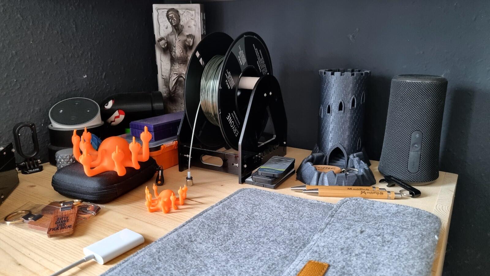 Den Filamenthalter obendrauf montiert habe ich übrigens nicht. Zum einen, weil ich kein Fan davon bin, weil damit evtl. Schwingungen über die Achsen in die Drucke gelangen können und zum anderen, weil ich den Drucker in einem Schrank betreibe und dort obendrauf ein Filamentrollenhalter steht, der über ein Loch im Deckel das Filament zu dem drunter stehenden Drucker transportiert.