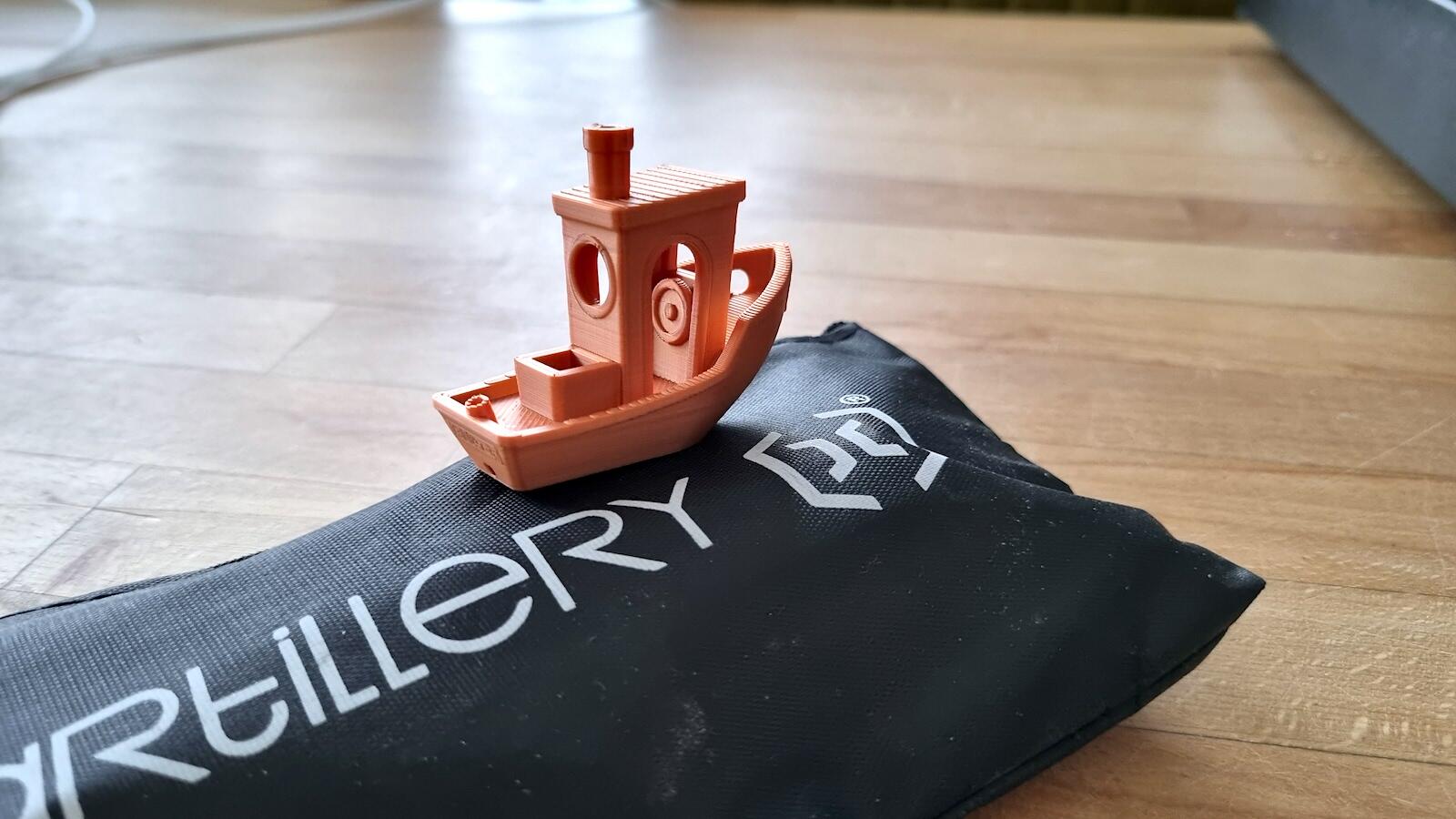 Nun habe ich tatsächlich loslegen können und mein erstes Benchy für einen Test gedruckt. Alles super. Also im Ernst. Das Benchy sieht wirklich gut aus für einen ersten Druck. Es hielt perfekt, keine Fäden haben gezogen, man sieht lediglich auf der Rückseite die von mir so eingestellte Naht und ansonsten kann man wirklich nichts meckern!