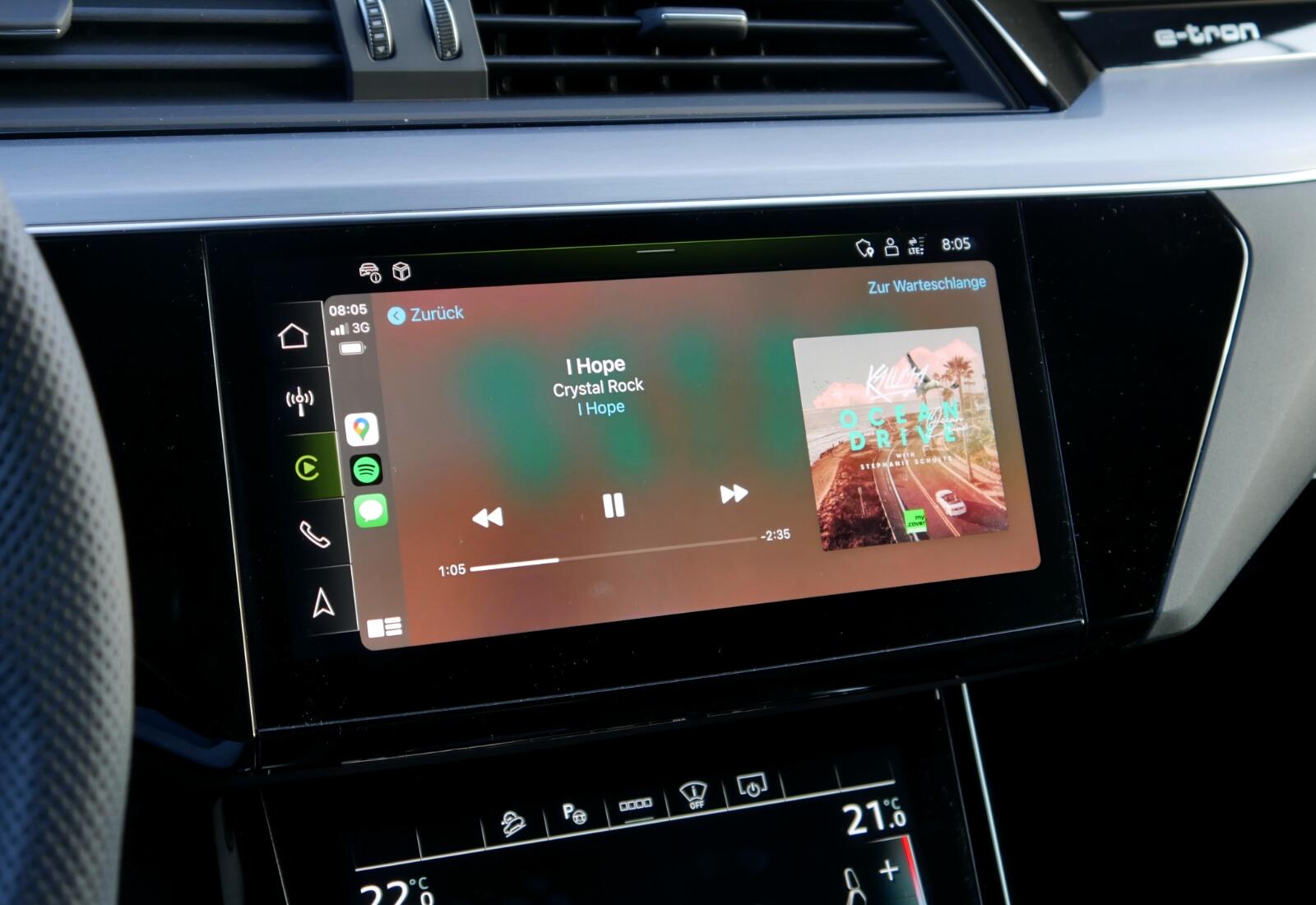 - Ich bin ein großer Fan von Apple CarPlay und habe das nach einem sehr kurzen Test der Audi-Oberfläche auch direkt im Alltag genutzt. Das funktioniert hier sehr gut und das Display ist schön groß für die Inhalte (nur eben etwas zu tief). Außerdem funktioniert auch Wireless CarPlay gut und zuverlässig. Das Smartphone kann in der Mitte (in der übrigens etwas viel los ist bei den Knöpfen und Elementen) in eine Halterung mit Qi gepackt werden und lädt dabei. Genau so muss da sein. Man setzt sich ins Auto, packt das iPhone in die Qi-Platte und fährt los, während CarPlay kabellos startet.