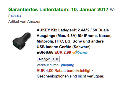 Kurzer Hinweis für alle Nutzer von Amazon Prime: Das AUKEY Dual-KFZ-Ladegerät gibt es dank einer Rabattaktion aktuell für 2,99 Euro.