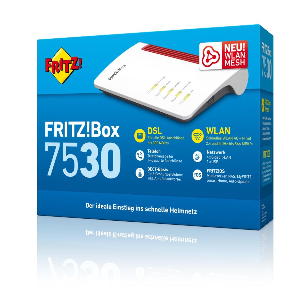 Die FRITZ!Box 7530 verfügt über 2×2 Dualband WLAN, vier Gigabit-LAN-Ports und einen schnellen USB-Anschluss. Eine DECT-Basis für Telefonie und Smart-Home-Funktionen sowie ein Anschluss für analoge Telefone sind ebenfalls an Bord. Die FRITZ!Box 7530 setzt zudem auf WLAN AC mit Multi-User MIMO und bietet eine integrierte vollwertige Telefonanlage.