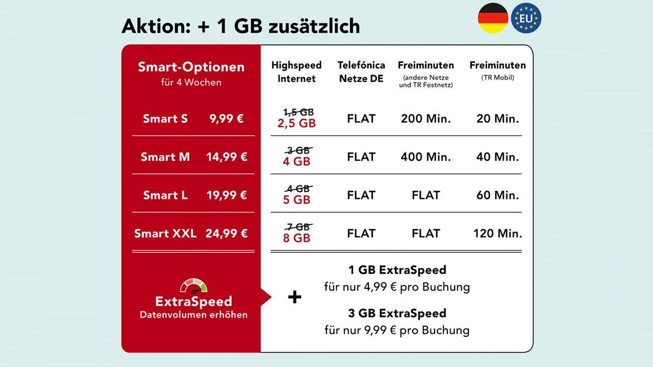 AY YILDIZ Kunden, die sich vom 1. Februar bis zum 30. April beispielsweise für die Smart S-Option für 9,99 Euro pro vier Wochen mit regulär 1,5 GB Highspeed-Datenvolumen entscheiden, erhalten zum bereits gebuchten Datenvolumen 1 GB dazu. Mit diesen 2,5 GB surfen AY YILDIZ Kunden mit bis zu 21,6 MBit/S.