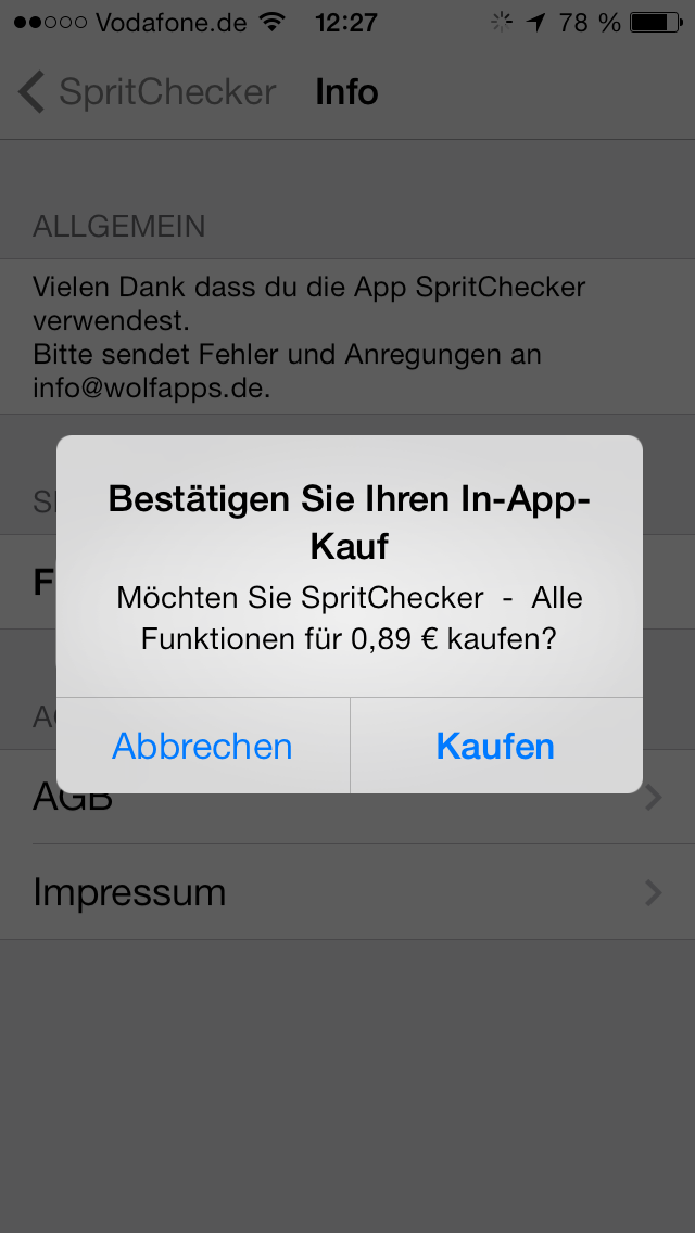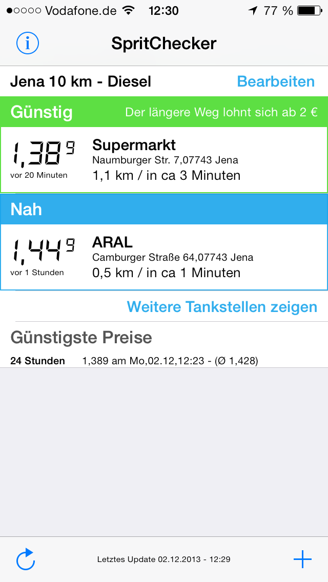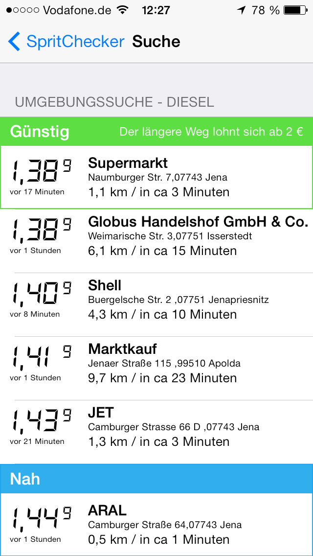 Da mich die Sache mit dem Banner bei  1-2-3 Tanken doch etwas gestört hat, habe ich mir noch den SpritChecker für iOS angeschaut und der hat mich mal voll vom Hocker gehauen. Feinste Optik und Funktionen bis zum Umfallen. Vor allem der Preisalarm bei Änderung oder bei Erreichen einer Preisgerenze ist natürlich erste Sahne. Alle Funktionen gibt es gegen einen In-App-Kauf von 0,89 Euro, da gab es keinen Grund zu zögern für mich. Einzige Kritik: Bisher ist keine Route planbar, eine Anfrage diesbezüglich beim Entwickler läuft bereits. [Update: Kleine Bugs werden in Kürze gefixt und ein Routenplaner kommt ebenso.]