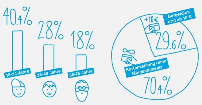 Immerhin über 40 Prozent der jüngeren Gäste (18 bis 34 Jahre) wünschen sich bargeldloses Bezahlen selbst für sehr kleine Beträge. Fast zwei Drittel der 18- bis 34-Jährigen wollen sogar immer mit Karte zahlen. Kartenzahlung scheint bei vielen Erhebungen eine Frage des Alters zu sein.