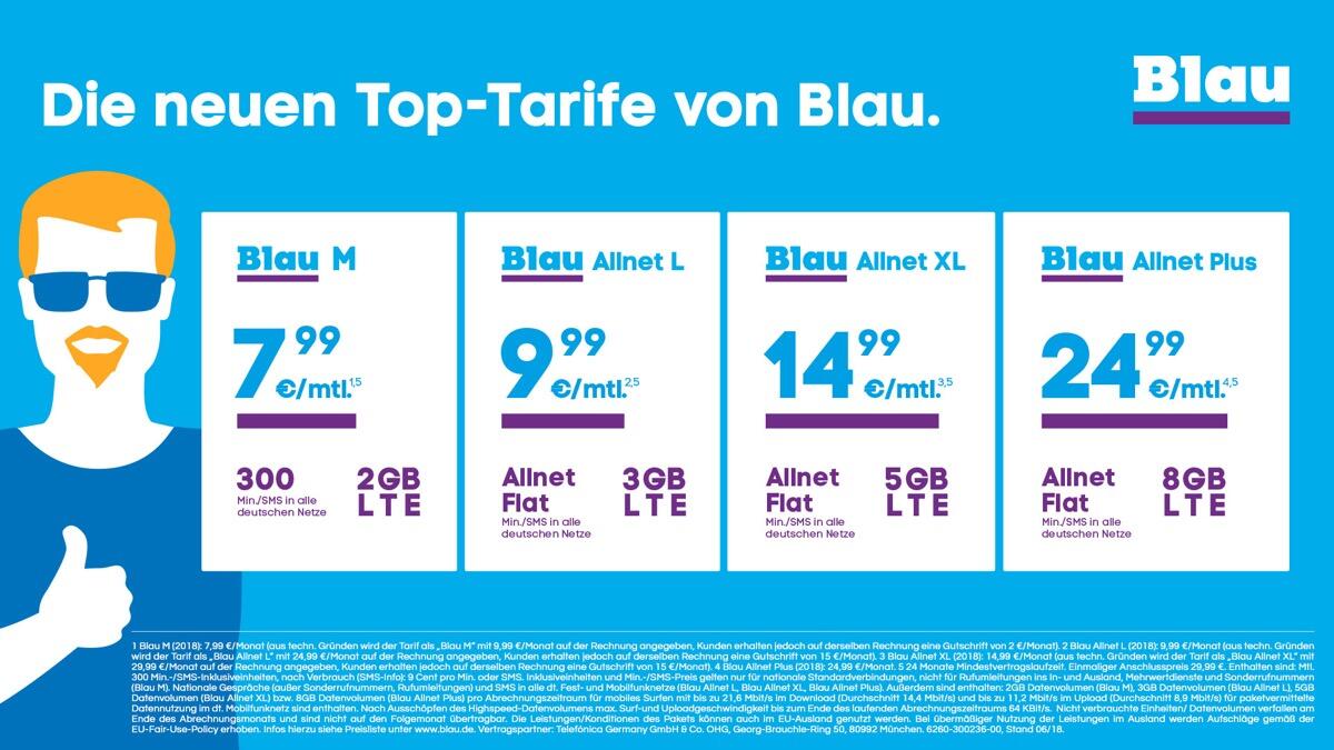 Blau startet in Kürze sein neues Postpaid-Tarifangebot. Der Basis-Tarif Blau M mit 2 GB Datenvolumen sowie 300 Freiminuten und SMS in alle deutschen Netze gibt es dann ab 7,99 Euro monatlich. Mit dem Allnet L Tarif zahlen Kunden für 3 GB und eine Telefonie- und SMS-Flat 9,99 Euro im Monat und für den Allnet XL Tarif mit 5 GB Datenvolumen inkl. Allnet-Flat geben sie 14,99 Euro monatlich aus.