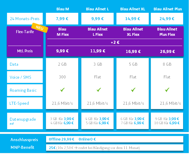 Den Tarif Blau M Flex gibt es mit 2 GB Datenvolumen sowie 300 Freiminuten und SMS in alle deutschen Netze für einen monatlichen Preis von 9,99 Euro. Mit dem Allnet L Flex zahlen Blau-Kunden für 3 GB und eine Telefonie- und SMS- Flat 11,99 Euro im Monat und für den Allnet XL Flex Tarif mit 5 GB Datenvolumen und der Allnet-Flat monatlich 16,99 Euro. Den Blau Allnet Plus Flex mit 8 GB Datenvolumen inkl. Allnet-Flat gibt es für 26,99 Euro monatlich.