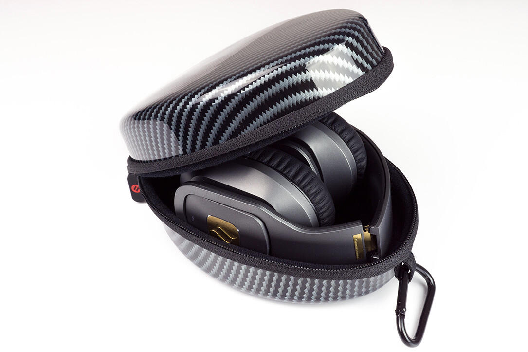 Anstatt eines schlichten Stoffbeutels bekommt ihr bei diesem Modell eine Hartschaltentaschen in Carbonoptik geboten. Zusätzlich zu den obligatorischen 3,5mm-Klinkenkabeln wird noch ein Adapter auf 6,3mm-Klinke mitgeliefert – sehr lobenswert. Viele AV-Receiver haben vorne als einzigen (analogen) Front-Stereo-Eingang eben diese Buchse.