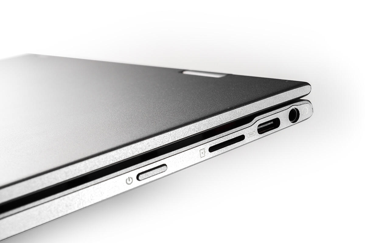 Gegenüber gibt es einen weiteren USB-C-Anschluss, einen 3,5-mm-Klinkenausgang und einen Slot für MicroSD-Karten – schade, dass man sich nicht für einen Full-Size-SD-Slot entschieden hat. Etwas weiter vorne wurde der Powerbutton montiert, der stark dem eines Smartphones ähnelt.