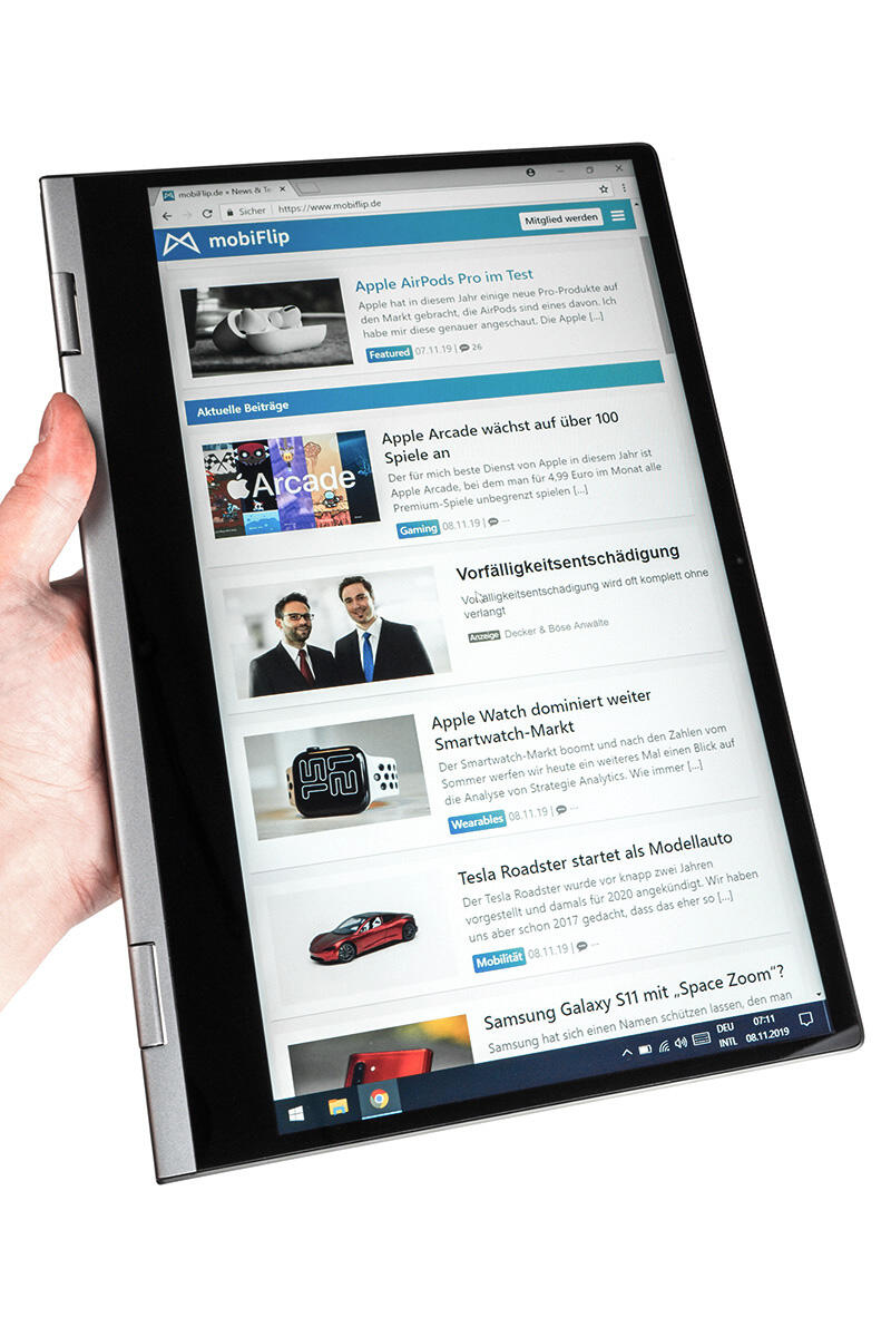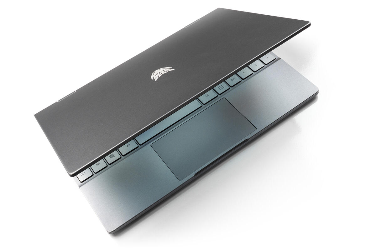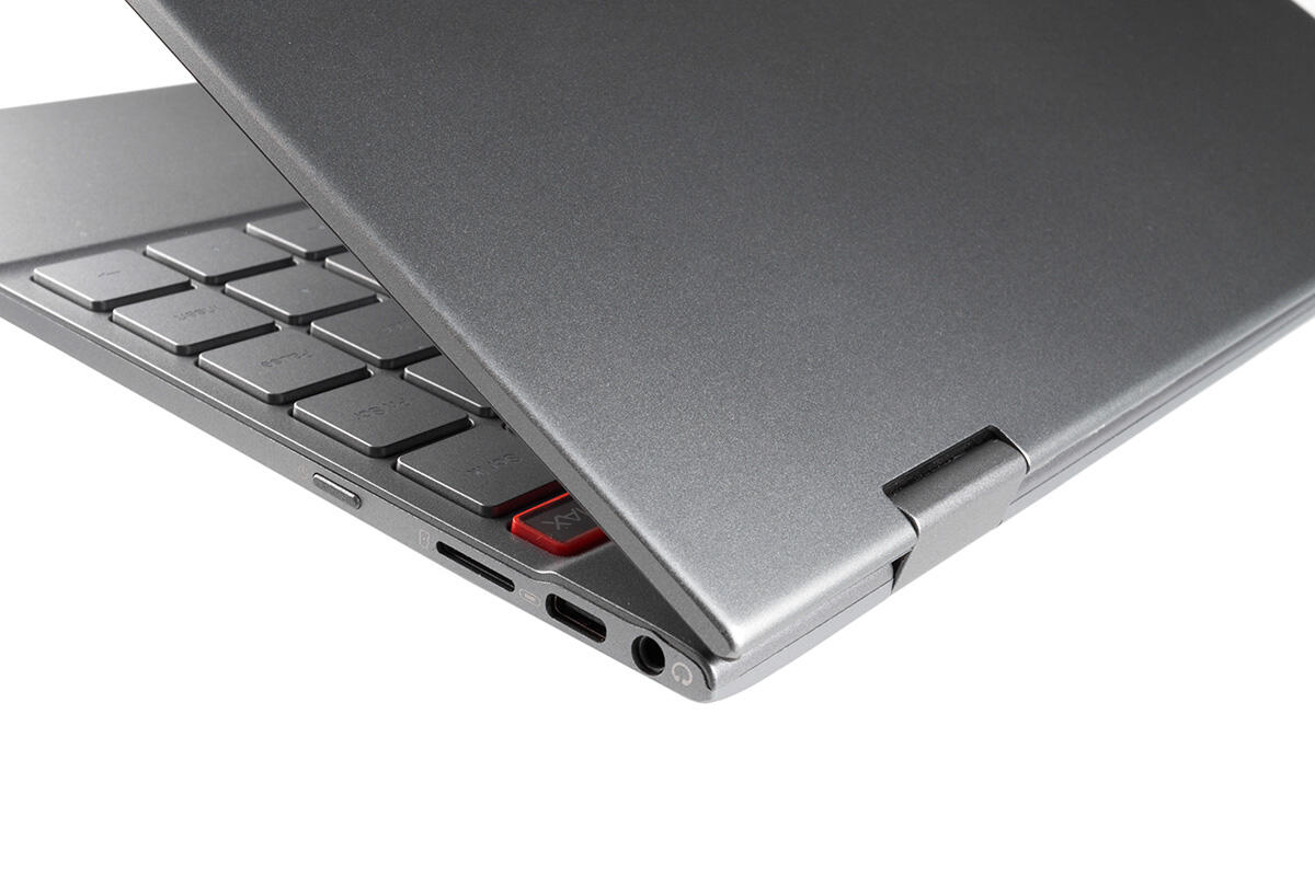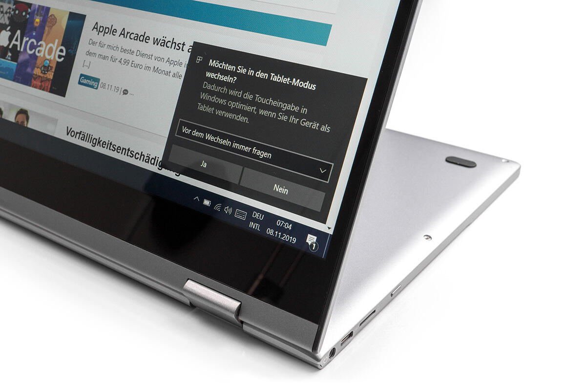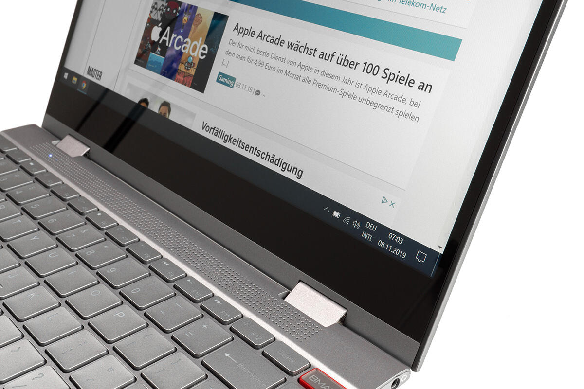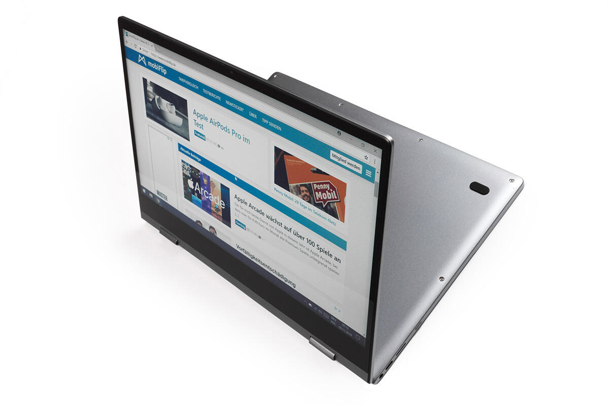 Leider arretiert sich der Deckel im voll umgeklappten Zustand nicht magnetisch an der Basis, wie es der Fall ist, wenn das Notebook geschlossen wird. Dadurch klappern die beiden Gehäuseeinheiten in 360-Grad-Stellung unentwegt aufeinander, wenn man sie nicht aktiv zusammenpresst.