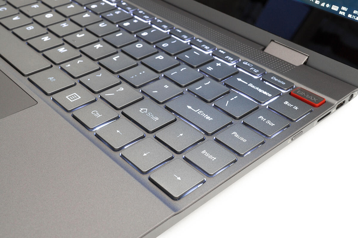 Sehr gefallen hat mir hingegen, dass die Tastatur des BMAX Y13 eine Hintergrundbeleuchtung spendiert bekommen hat. Sonderlich homogen und kräftig ist die Ausleuchtung zwar nicht – auf dem Foto kommt sie heller rüber, als sie in natura ist – aber immerhin gibt es überhaupt illuminierte Tasten.