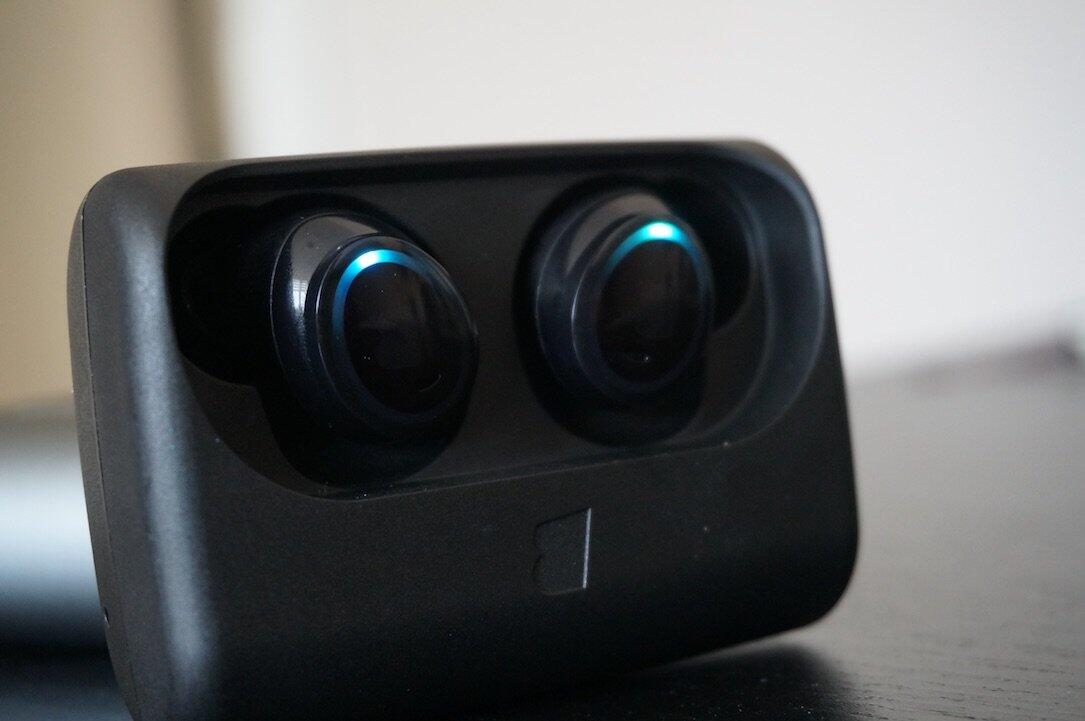 Es gibt eine LED-Anzeige bei beiden Kopfhörer-Teilen, die mit Farben signalisiert, wie weit der Ladezustand (Rot, Gelb, Grün und Blau) ist. Das Case besitzt einen kleinen Spalt, durch den man die LEDs auch im geschlossenen Zustand sehen kann.