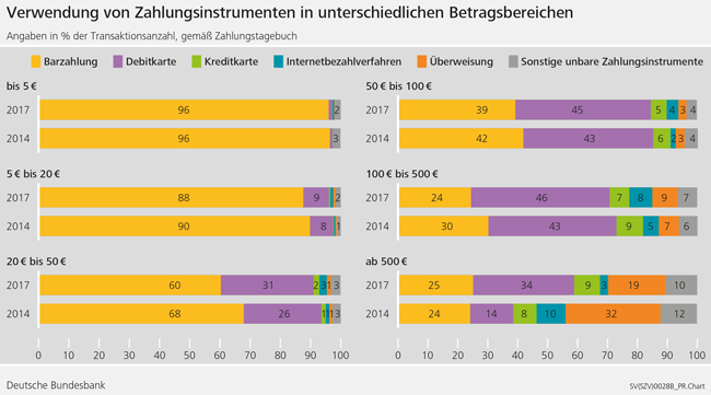 Demnach begleichen Privatpersonen 48 Prozent der Waren und Dienstleistungen mit Banknoten und Münzen, etwa 40 Prozent zahlen mit Karte. Vor allem Kleinbetragszahlungen bis 5 Euro werden fast ausschließlich bar bezahlt. Ab einem Einkaufswert von 50 Euro nutzen die meisten Befragten aber lieber elektronische Zahlungsmittel.