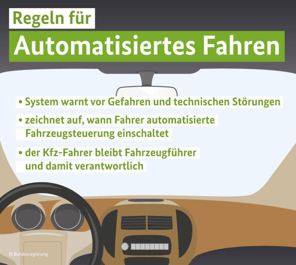 Zunächst einmal weist die Regierung darauf hin, dass auch beim Einsatz des Computers die letzte Verantwortung grundsätzlich beim Menschen bleibt. Automatisierte Systeme müssen jederzeit durch den Fahrer übersteuerbar sein.