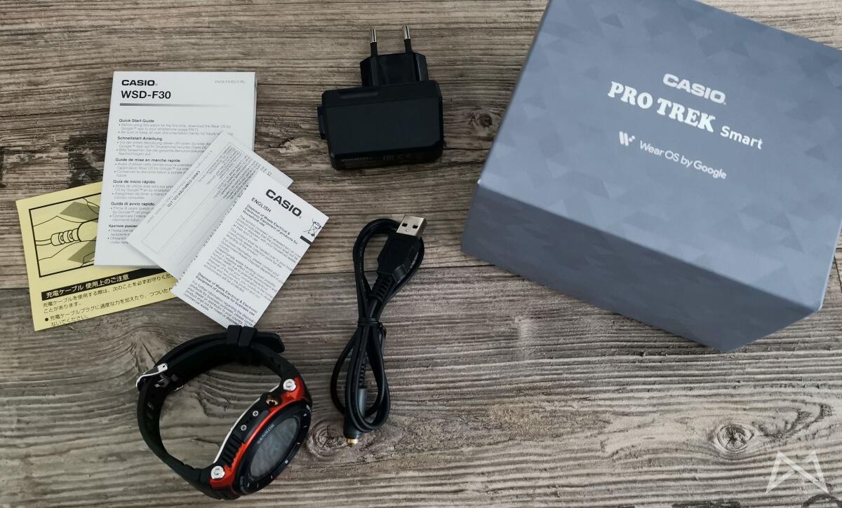 Im Lieferumfang befindet sich wie üblich die Uhr selbst und ein wenig Papierwerk. Dazu noch ein passendes Ladekabel für den Casio-eigenen Ladeanschluss mit normalem USB-Anschluss auf der anderen Seite und ein Netzteil mit USB-Anschluss, was heute nicht mehr selbstverständlich ist.