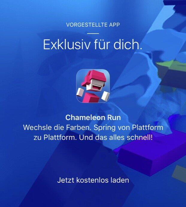 Alles was man dafür machen muss, ist in der Store-App die Startseite aufzurufen, dort runter scrollen, bis man Chameleon Run sieht und den Anweisungen folgen. Auf dem iPad klappt das vermutlich nicht, ein iPhone müsste also vorhanden sein.