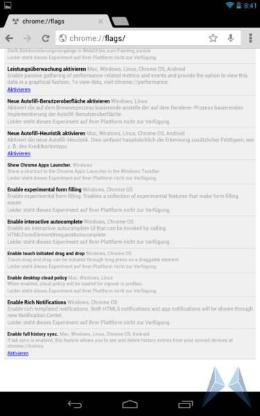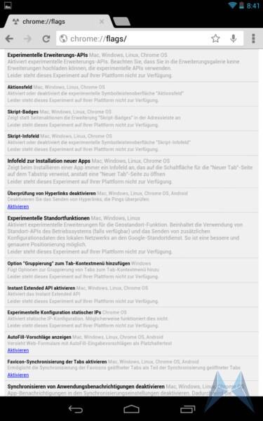 Google hat ja bekanntlich neben der stabilen Version des Android-Browsers Chrome auch eine Beta-Version mit Vorabfunktionen bei Google Play platziert. Damit bekommen die Nutzer bereits einen Vorgeschmack, was in die finale Ausgabe Einzug halten könnte, allerdings kann es wie bei jeder Vorabversion auch mal zu Problemen kommen. Mit dem neuesten Update für die Chrome Beta für Android führt Google nun eine bereits vom Desktop bekannte Funktion ein, die chrome://flags. Ruft der Nutzer nämlich chrome://flags im Browser auf, dann erhält er Zugriff auf experimentelle Funktionen.
