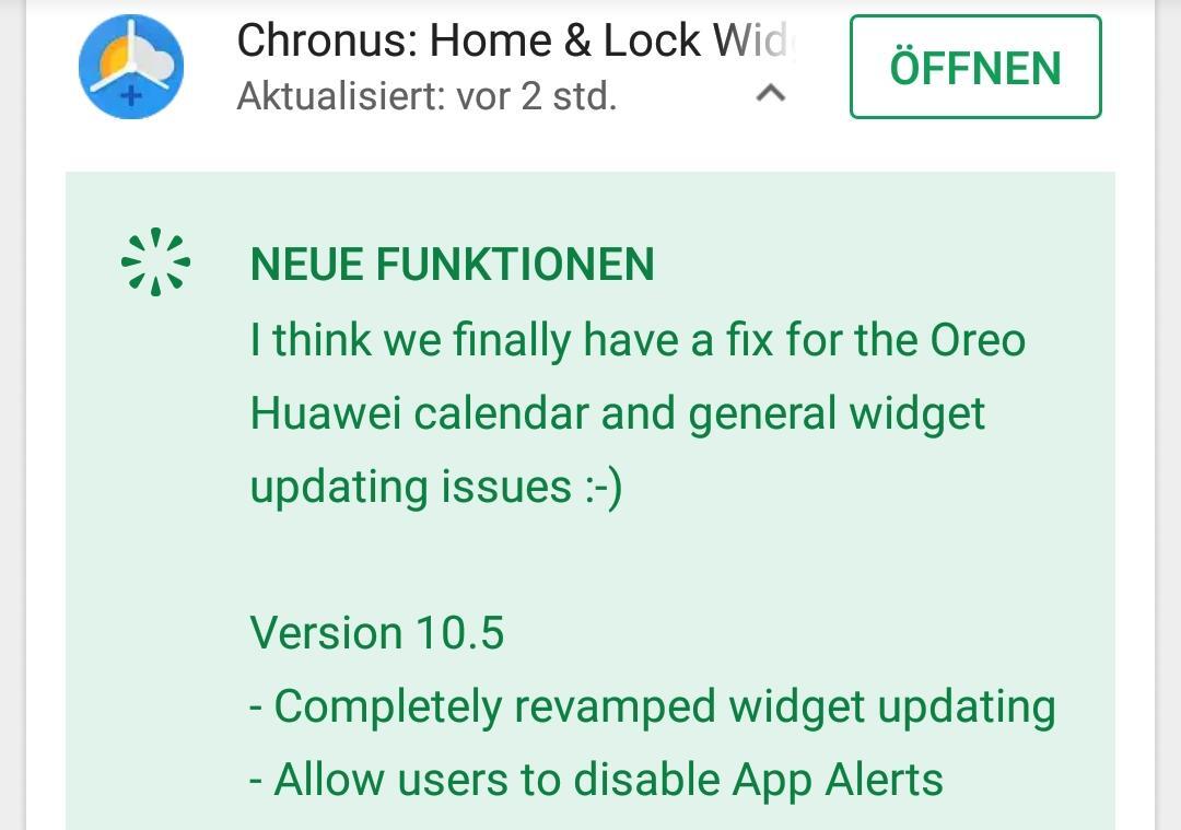 Hier kommt das jüngste Update von Chronus – meinem Favoriten vor DigiCal ins Spiel. Im Changelog wird davon berichtet, dass man nun einen Fix für dieses Problem bei Huawei Smartphones gefunden hätte. Ich habe direkt wieder die Chronus Agenda-Ansicht unter mein Uhren/Wetter-Widget auf das Huawei P20 Pro gezerrt und werde das beobachten…