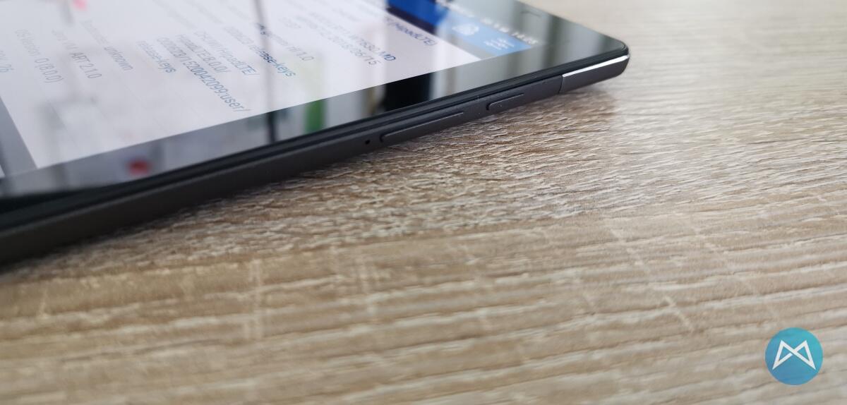 Wenn wir weiter um das Gerät rumgehen finden wir seitlich angebracht die Lautstärke- und Power-Taste auf einem dunkel abgesetzten Plastikstreifen.