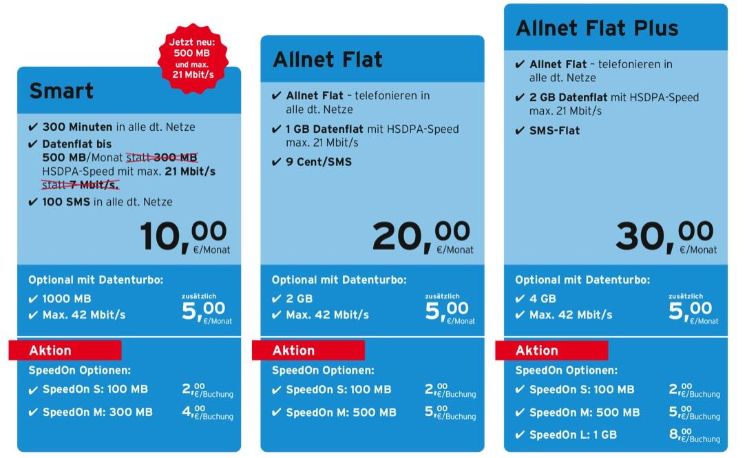 - 1000 MB bei max. 21 Mbit/s statt wie bisher 500 MB für 8 Euro/Monat